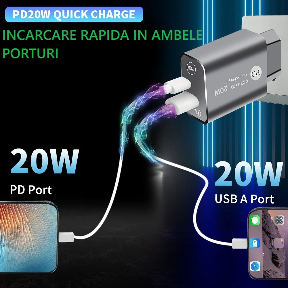 2 porturi: USB + Type-C – încarcă simultan două dispozitive.